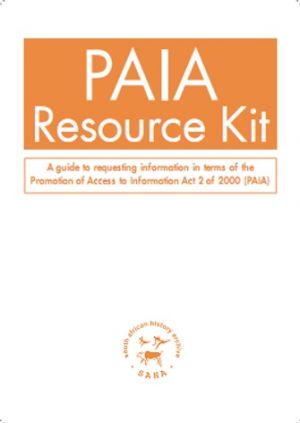 The PAIA Resource Kit is an innovative tool that was developed during the pilot phase of the Freedom of Information Project: Capacity building in the Community based Sector (PAIA). It provides step by step instructions on completing the forms prescribed for requesting information from public and private bodies under the Promotion of Access to Information Act (PAIA).