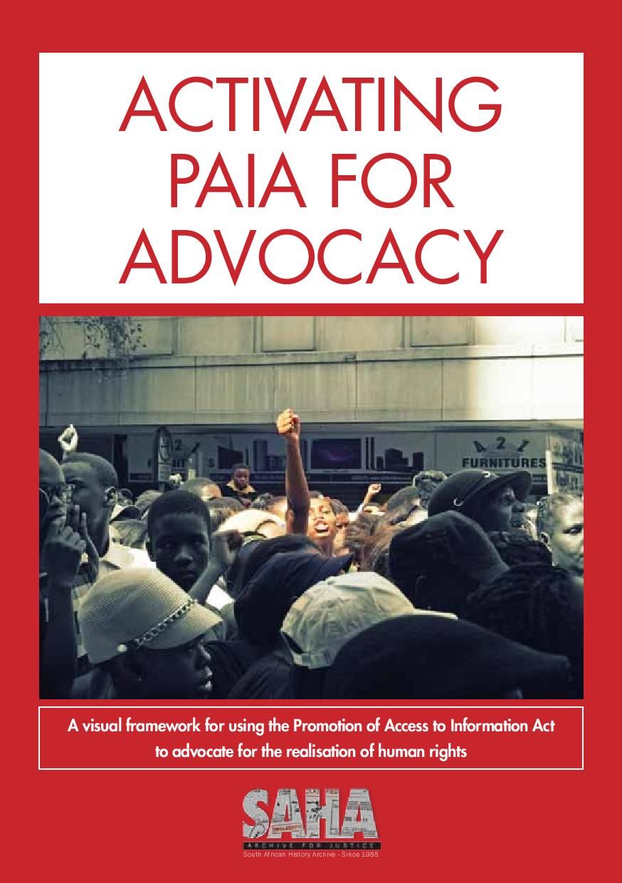This guide is designed to provide a visual framework that aims to assist individuals, communities and organisations in activating information to advocate for changes that will ensure the realisation of their human rights. The guide highlights the role of the Promotion of Access to Information Act, 2000 (PAIA) as a strategic advocacy tool that can be used when advocating for human rights.